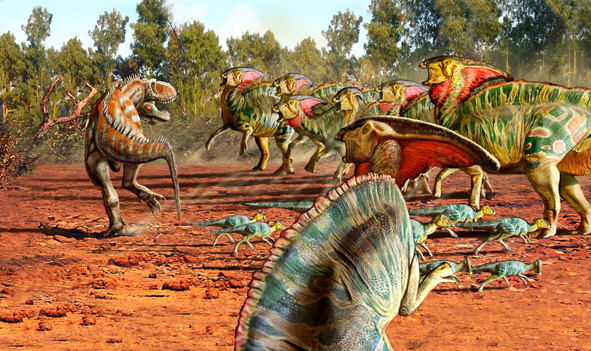 This is a personal favourite. Robert Bakker (always classically-minded) compared this illustration to the depiction of a battle scene by Alexander the Great (mostly for its dynamics). For me this is the ultimate Dinosaur Ochestra of Parasaurolophus protecting their babies with the basso-profundo horn section blowing at full earth-shaking intensity!