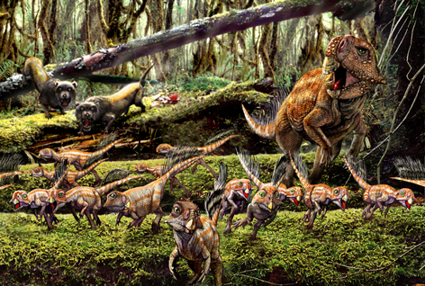 The discovery of a giant mammal with a baby dinosaur in its belly was all the rage a few years back. The concept of a mammal that could attack and eat dinosaurs in the Cretaceous (when everybody had assumed that all mammals were the size of rats or -at most- small cats squirming around and under the legs of dinosaurs) was shattering and revolutionary. In this scene a pair of the “monstrous” Repenomamus giganticus, which were the size of a badger—larger than some dinosaurs that lived in the same region of China at this time- is about to make a meal of a flocking family of Psittacosaurus, the famous quilled, porcupine-like ornithischian dinosaur in the line of the primitive ceratopsians. They were so abundant that could be considered only second to the Mongolian Protoceratops.