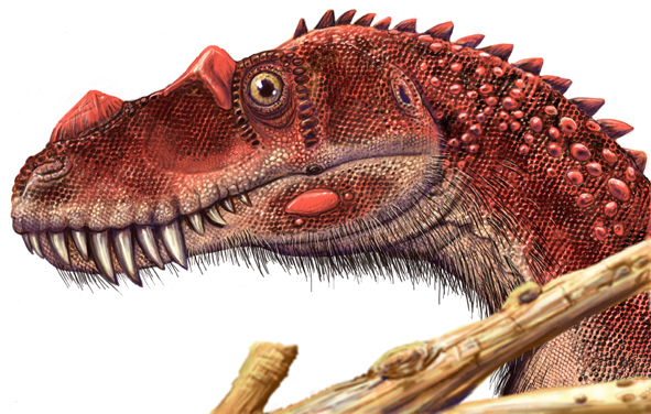 This juvenile Ceratosaurus is based on a real skull… note the enormous teeth compared to the maxilla. “Beard” is optional…. but since it is a juvenile I dared to be a little heretical and added protofeathers to a fairly basal theropod.