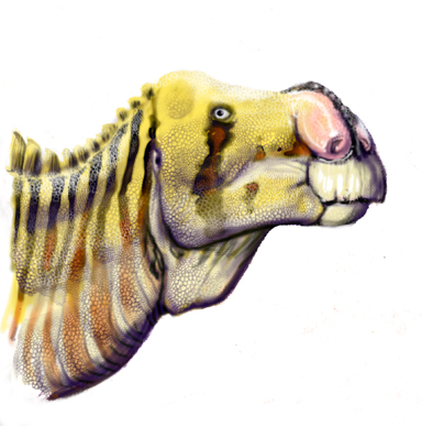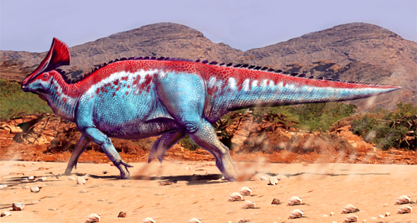 For anyone with a taste for creativity and colour, Hadrosaurs -like this strangely crested Olorotitan- simply open the gates for a flood of possibilities. I could finally see a mounted Olorotitan specimen in the Natural History Museum in Brussels (the best dinosaur museum in Europe). It is a lightly-build animal, probably lighter than I depicted it here. But the crest of hadrosaurs is always a challenge to reconstruct (specifically the external appearance and the possibility of external attachments to it). Put that together with the rich skin topography and frill ornaments and you get as many possibilities as imagination allows you. Please note that I have reserved bright colours to display items like crests and frills… although rich skin colour patterns could have been anywhere, given the differences in shapes and size of the scales. The question of colours is… did big dinosaurs have colour vision or not? I contend that they had.