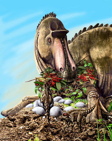 All these are older illustrations that led to the Maisaura I included in the mural and specially the “Orchestra attack” by Parasaurolophus from a previous post (which also tried to address the problem: how these animals would defend themselves agains the tyrannosaurs and other predators?). But I think they are experiments worth showing. Here’s an old Maisaura tending the nest (from “Dinosaurs In The Round”).