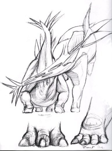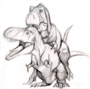 The subject has always been a spiny one…let alone the problem of size and the (sometimes) the spikes! Her are a couple of my solutions. The first one  is this couple of T.rexes having fun and putting their puny forelimbs to some use (as hooks to grapple their partner)… here’s the sketch where the previous illustration was based: