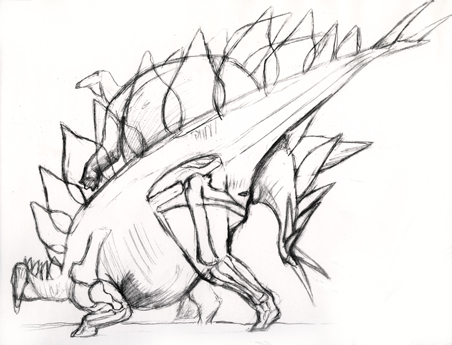 But the really thorny issue is tackled in these next two unpublished sketches where I have tried t0o solve the very popular issue of how Stegosaurus had sex… my solution was pretty basic: there’s ONE obligatory point in their anatomy where the two animals had to meet at all costs (that is: the cloacas). I reconstructed the anatomical possibilities  of the posture of the rest of the bodies around the united cloacas instead of going other ways around. Of course I had to take in consideration  how flexible could have been the tail with all those big plates on top, holding it stiff… the tail could not flex down, but it could go up and down and  sideways fairly easily!