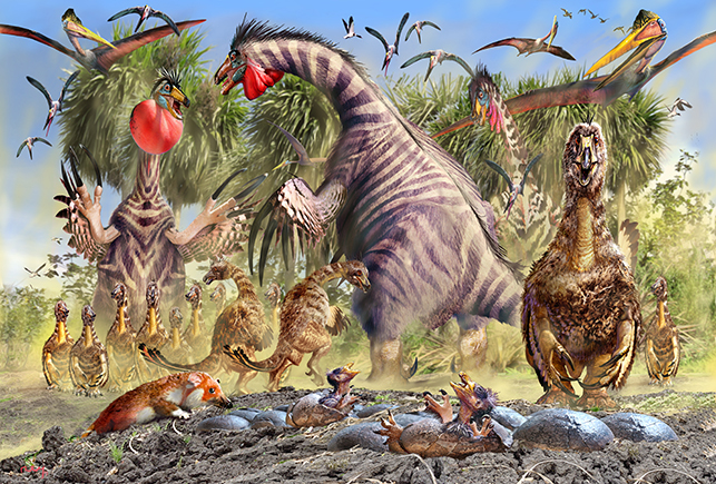 You saw the process of making this piece-de-resistance. All the protagonists are now in place and the hypothetical life cycle is now complete. Of course it wouldn’t be complete without the opportunistic mammal trying to predate on the newborns. Regarding skin ornaments and display items in the adults, obviously everything gets increasingly hypothetical. Thanks to Darren Naish I’ve got new information regarding the reconstruction of the feet o Therizinosaurus that I might be able to share in the future… ot seems that they were weirder than previously thought! I will also possibly change the background to a less drier environment. Th eggs are based on a real cast of therizinosaur eggs (as I mentioned earlier). The pterosaurs are different kinds of Azhdarchids, similar to Quetzalcoatlus the typical pterosaur from the Cretaceous.