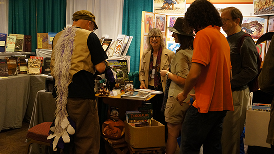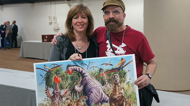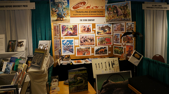 This time Carmen and I were not just a lonely presence trying to sell some handmade posters: my friends of Stone & Company and specifically the indefatigable Florence Magovern (in this picture with Carmen Naranjo, my partner) had organised a wonderful stall at the venue with quite a few of my things (including the newly released Golden Book and the Encyclopaedia) and I would be sitting there, signing and presenting them… the prints this time looked amazingly professional, in different sizes and mounts, always at a vey high quality level. The stall quickly became a gathering place at the meeting and I soon understood that it would be impossible to “sit”…in the process I lost my voice talking non-stop to so many good friends, palaeontologists, budding and veteran paleoartists and everybody else from 8 in the morning ’till eight in the evening(and beyond) every day.