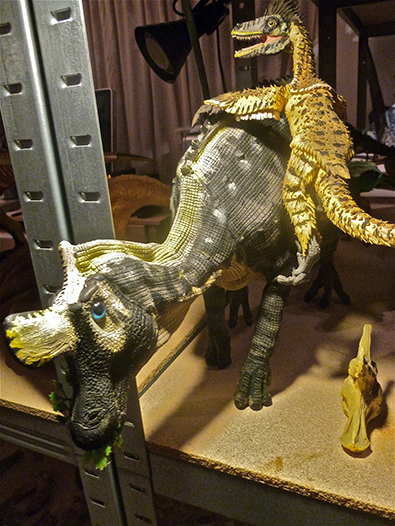 Here are they proudly displayed on my shelves… you might have to mind the anachronism but I couldn’t resist making the Deinonychus with its hard and sharp claws jump on the back of Lambeosaurus! It’s almost like they are alive!