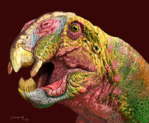 I am currently working in a another, brand new book about African prehistoric life with my friend Anusuya Chinsamy. She is the foremost expert in fossilised integument as well as African prehistory. We have worked in several books together and she has always been keen in open my horizons to animals other than our beloved dinosaurs. I love doing this kind of close-up portraits… it allows me to concentrate in the “personality” of the creature instead of seeking challenging action shots. I have done this restoration for a dicynodont using some excellent fossil pictures she has provided me with. I have been careful to follow the skull as much as I could… this is the result and it pales dinosaurs in outlandishness! The book will feature many more illustrations and most of them are going to be either quite new or new versions of familiar material. I expect to follow this thread very soon.