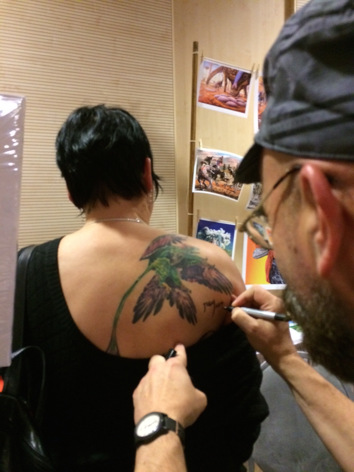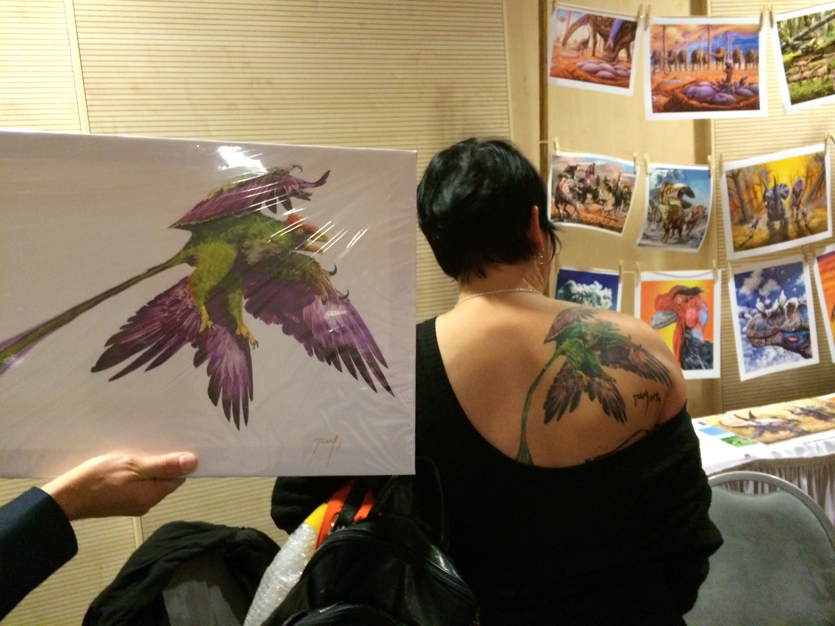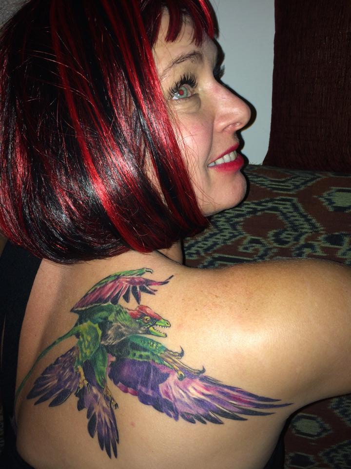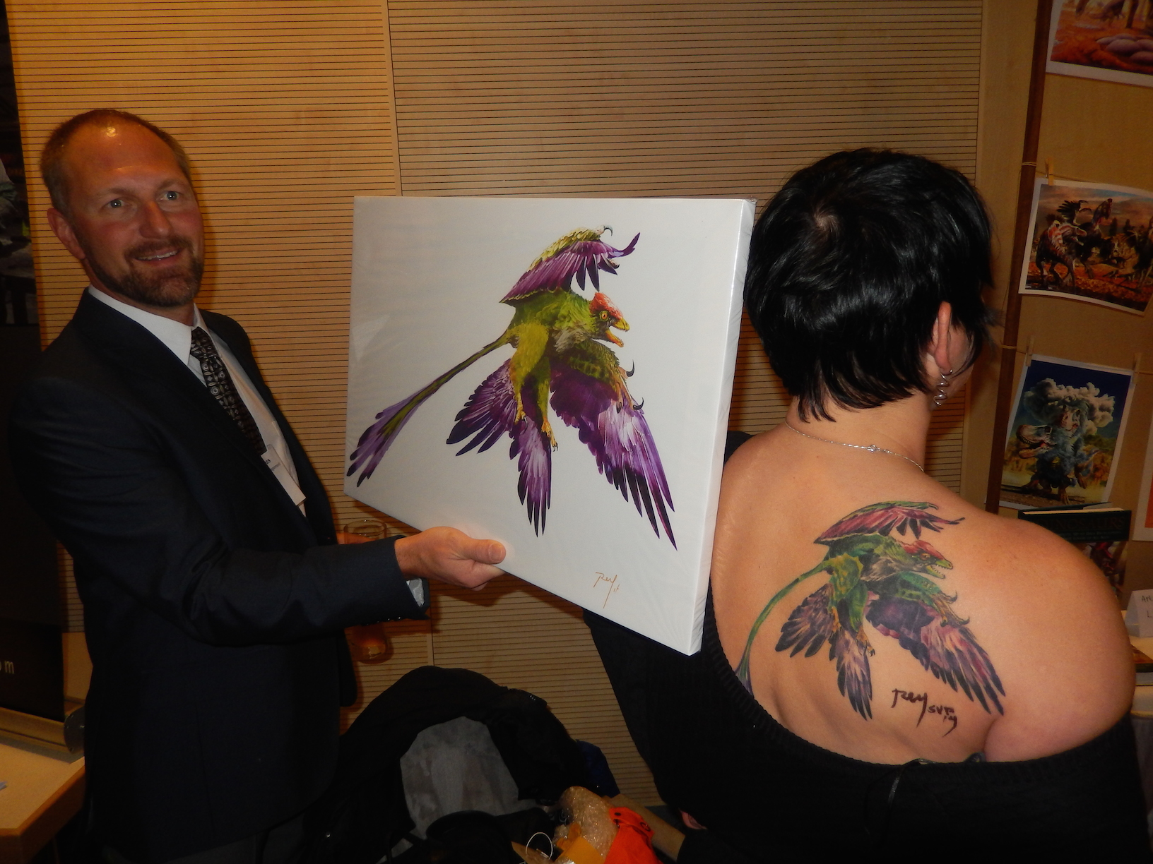 Scott has gone MICRORAPTOR this time! I took the opportunity in SVP in Berlin this year to present his new commission: a new recreation of Microraptor to both him and his beautiful and charming partner Merb Jones. She surprised me with the painting already tattooed on her shoulder! Yes… the results were quite beautiful, and in the flesh! According to the lucky lady, the session was not painful and done by a consummate tattoo artist that did everything in only a four hour non-stop sitting! Never expected such a likeness in of my wok in a tattoo!… Even the colours were impeccable. I was graciously invited to sign it!