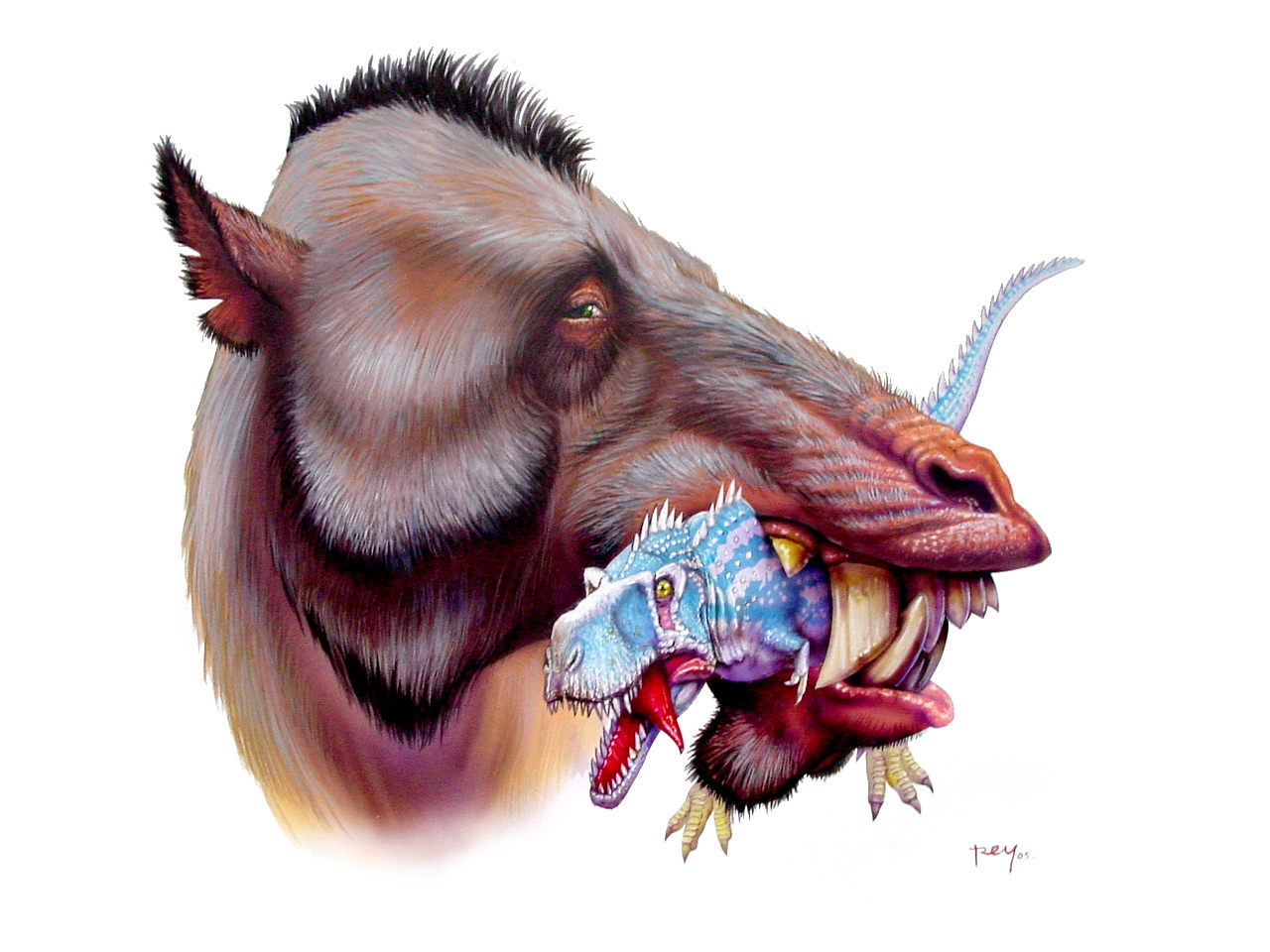 I have a bit of collaboration stories with Scott Foss… mammal guy he is, years ago he commissioned me to do this humorous piece to celebrate what a really oversized Entelodont pig would do to a T. rex…wishful thinking on his part, I know! But gladly he has change sides… only for now!