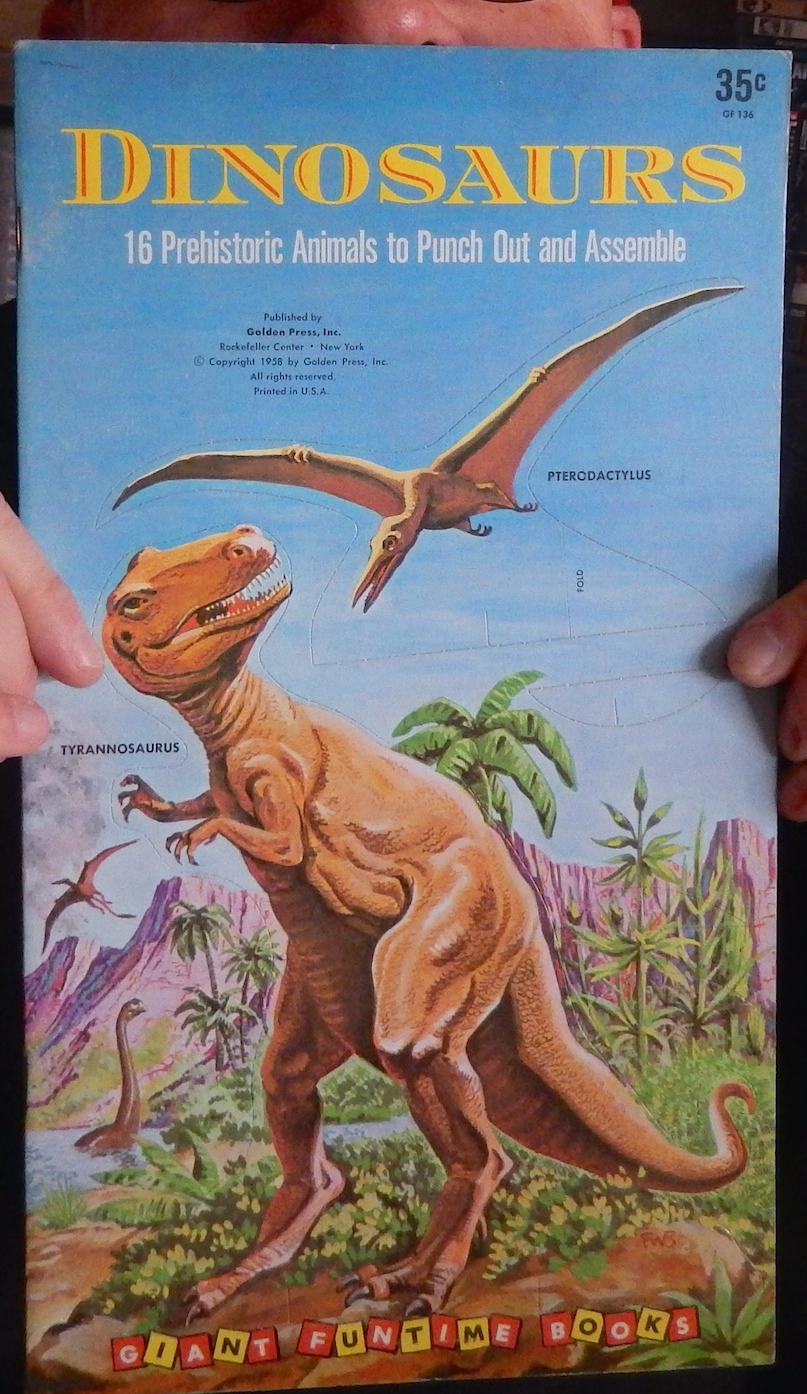 From very early in my life, one of my main interests have always been the popularisation of the accurate (but attractive) image of the Dinosauria. Decades ago I was given a couple of books that, apart from my father’s own art lessons, were my main paleoart education. In recent times I have had a happy reunion with these popular press books and have been able again to admire the quality of some of their illustrations. They are not only affectionate memories. This Giant Funtime Book of Dinosaurs for example looked positively huge in my tiny hands in those ages…but the awesome (now defunct as genus) ‘Brontosaurus’ (AKA Apatosaurus) occupied two pages, was detachable and could stand with the aid of its bases. This little museum piece is hard to find these days but I owe it to my partner Carmen and an e-bay link found by Mike Fredericks of the essential source Prehistoric Times. Look out for my new interview and feature of new stuff in one of the forthcoming issues