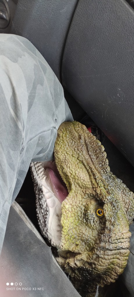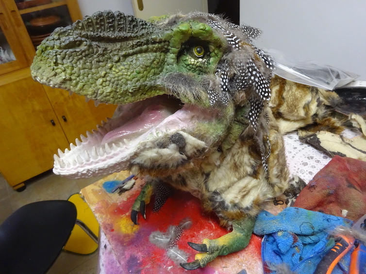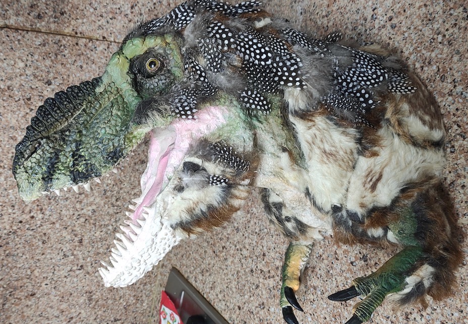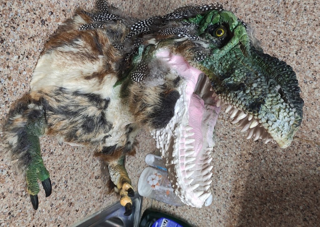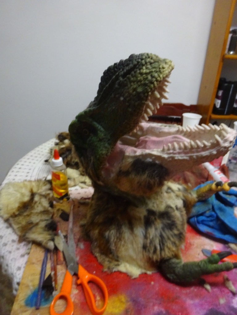 After repainting (the chest skin looked great with the texturiser) . I started the final part of the job. New skin! But this time would be a combination of fake furry skin and ornamental feathers… et voila … the final product, even if not perfectly proportioned as a real Tyrannosaurs rex, it could pass fairly well as a juvenile T. rex… Nanotyrannus anyone? No, more like “Jane” the young Tyrannosaurus rex.