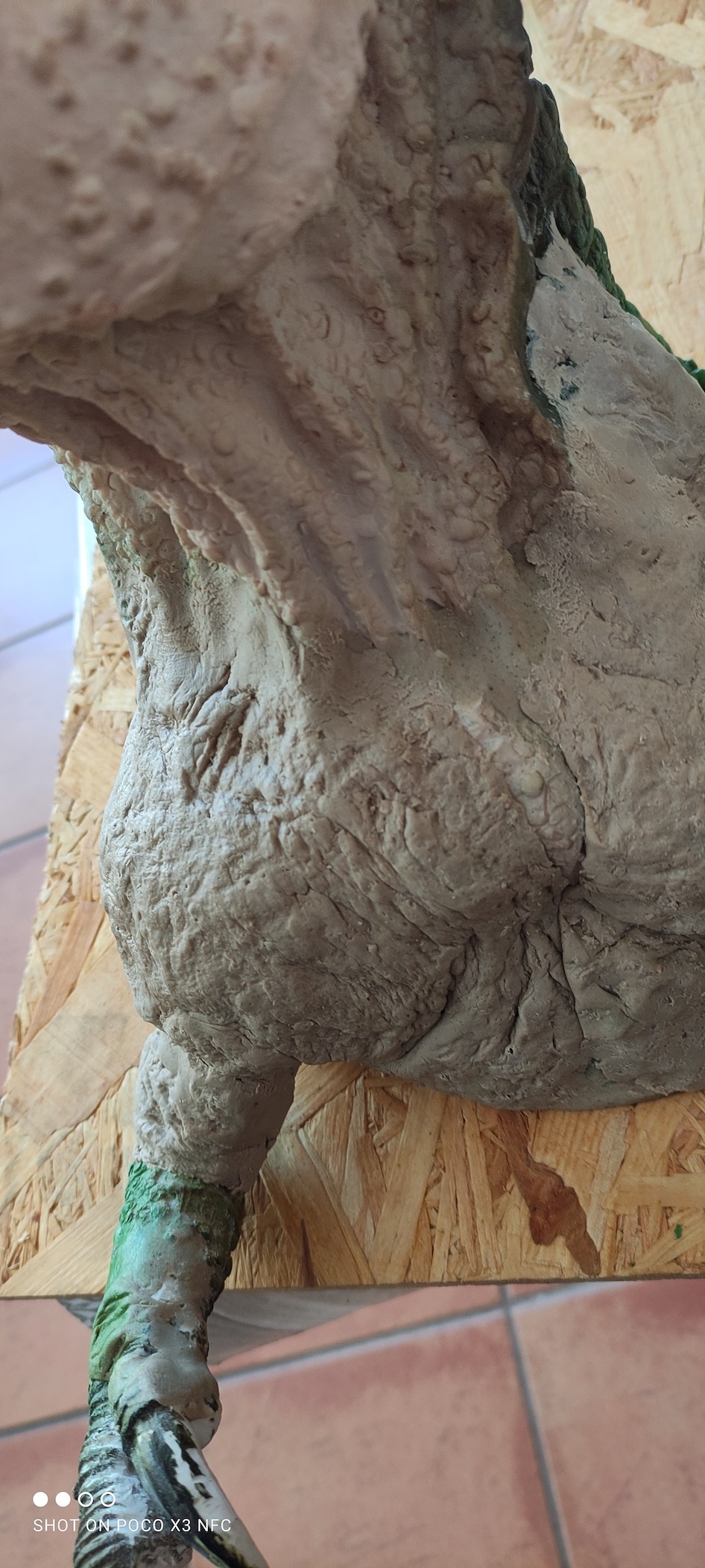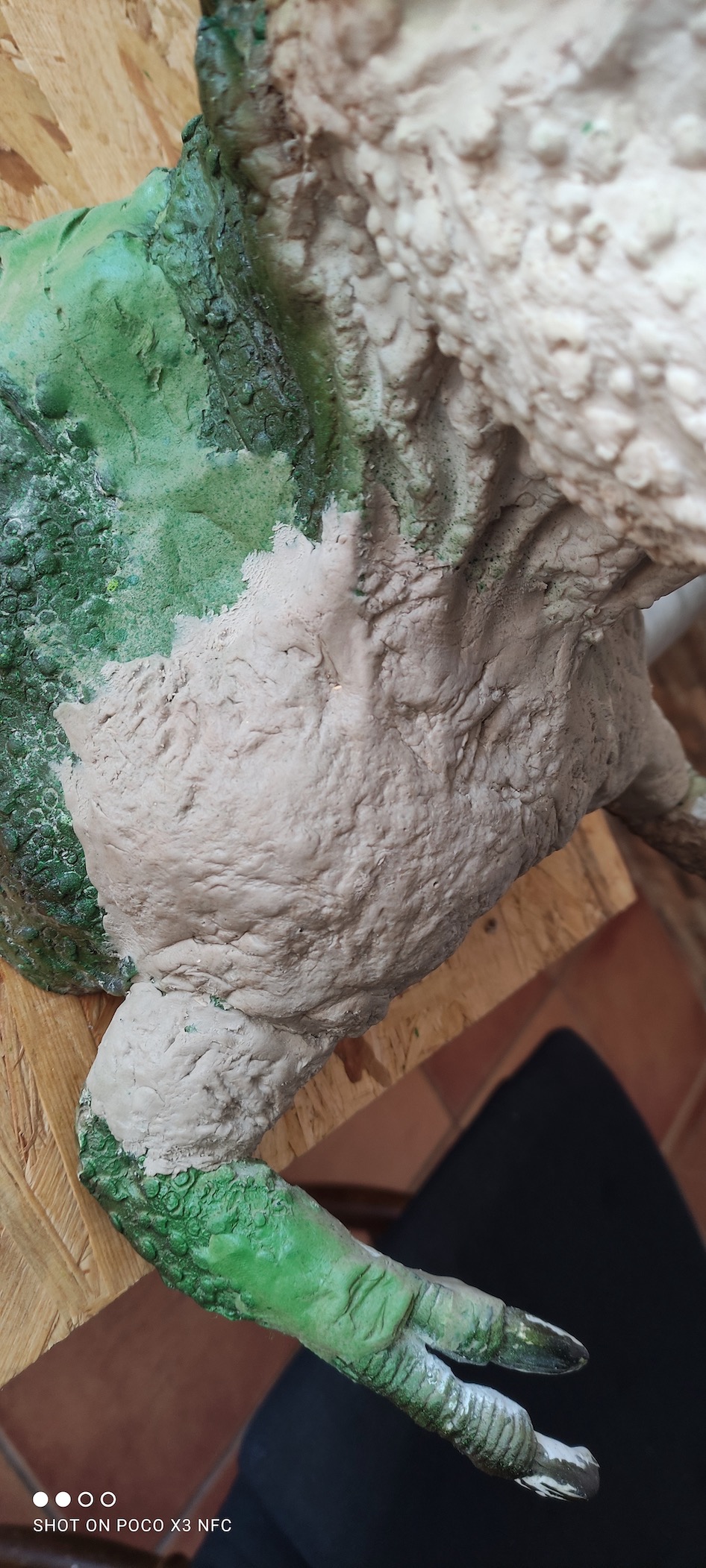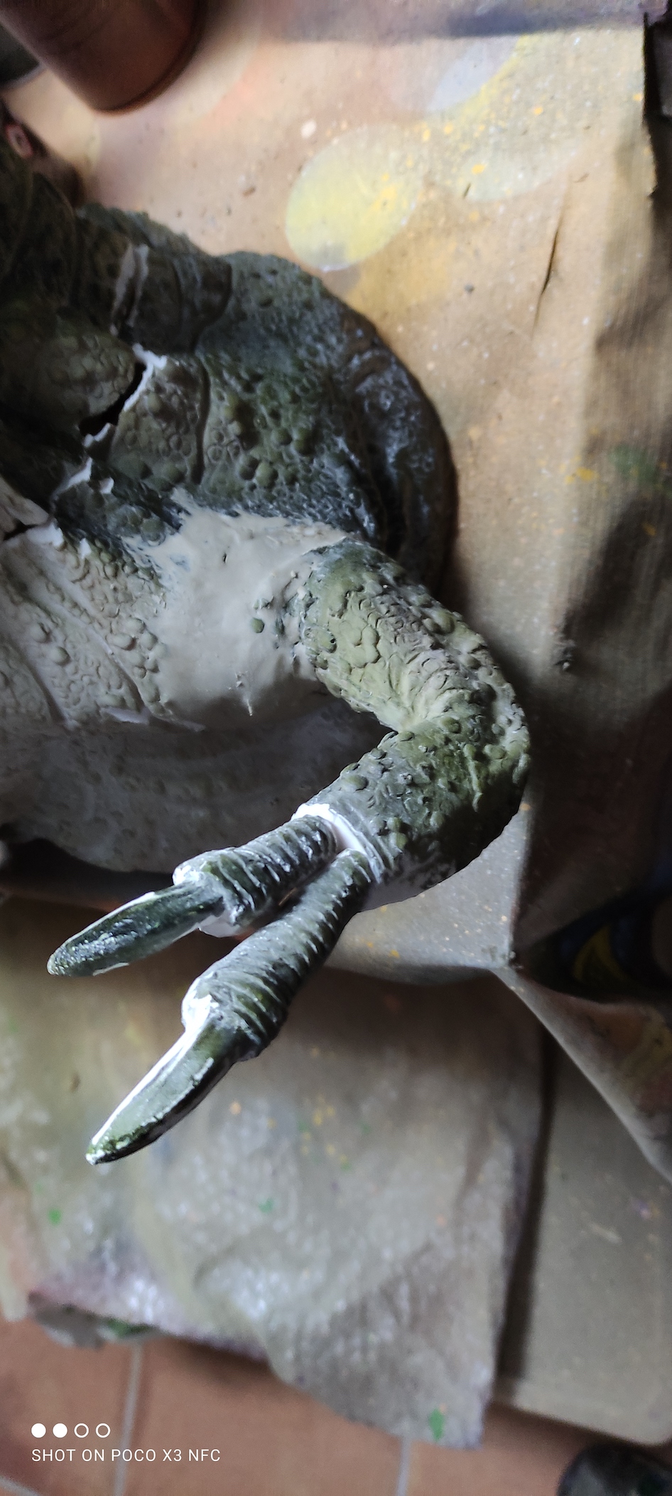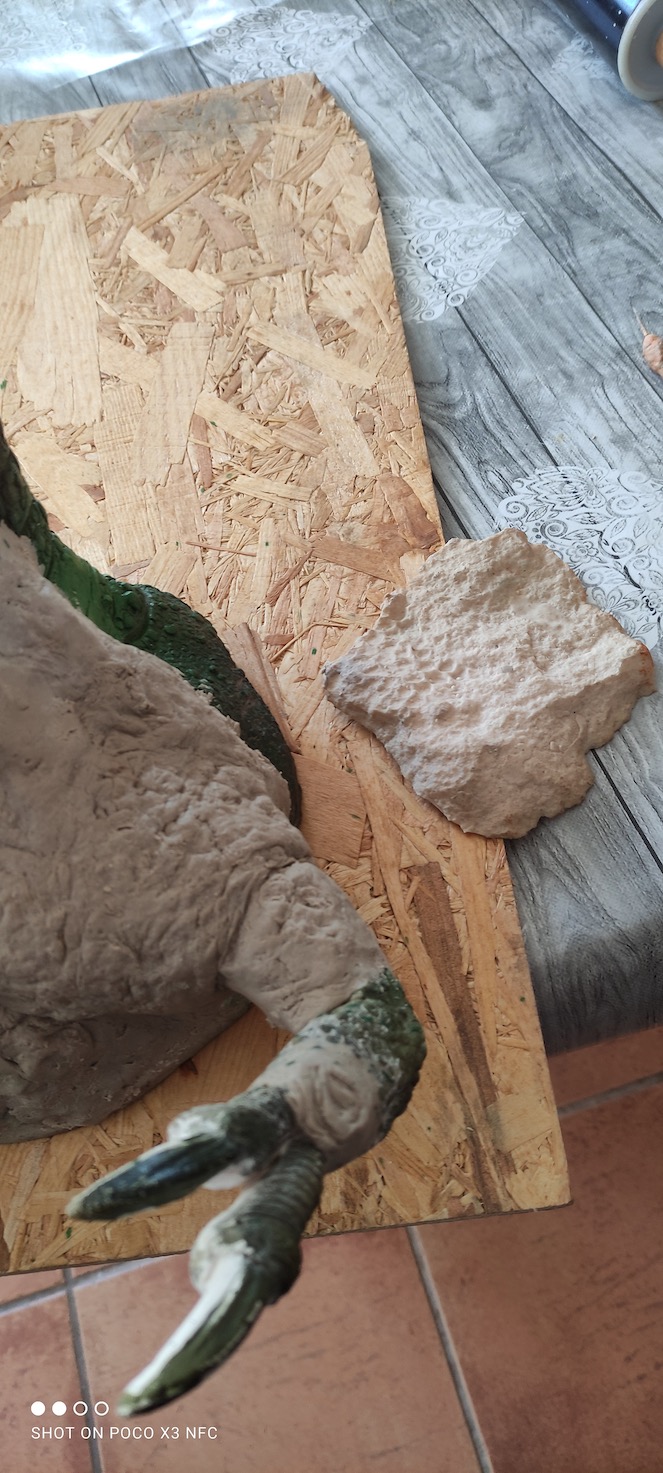 The arms and claws were originally quite big, in the wrong posture and it had no chest. The fingers were disproportioned. The skin texture was crocodilian…. still …there was something appealing to it. So with the help of my friends of the Soteno/Jimenez workshop the first thing I did was chop everything off … and put the pieces in the luggage! Good that I did it, because it might have become a burden to transport as it was. I turned it literally into a resin kit!