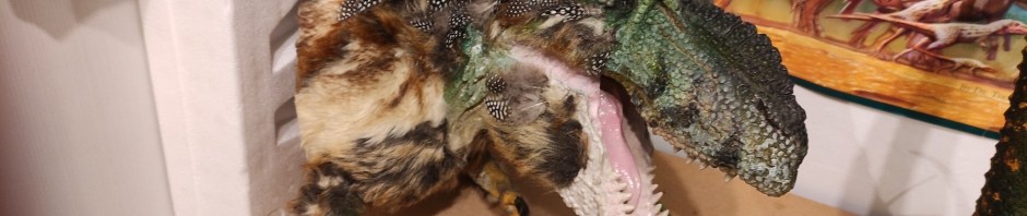 After repainting (the chest skin looked great with the texturiser) . I started the final part of the job. New skin! But this time would be a combination of fake furry skin and ornamental feathers… et voila … the final product, even if not perfectly proportioned as a real Tyrannosaurs rex, it could pass fairly well as a juvenile T. rex… Nanotyrannus anyone? No, more like “Jane” the young Tyrannosaurus rex.