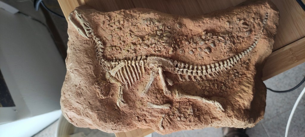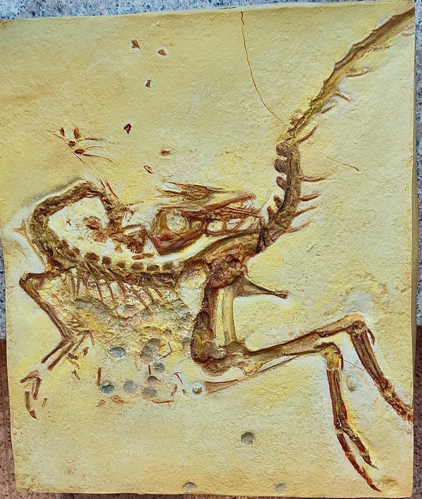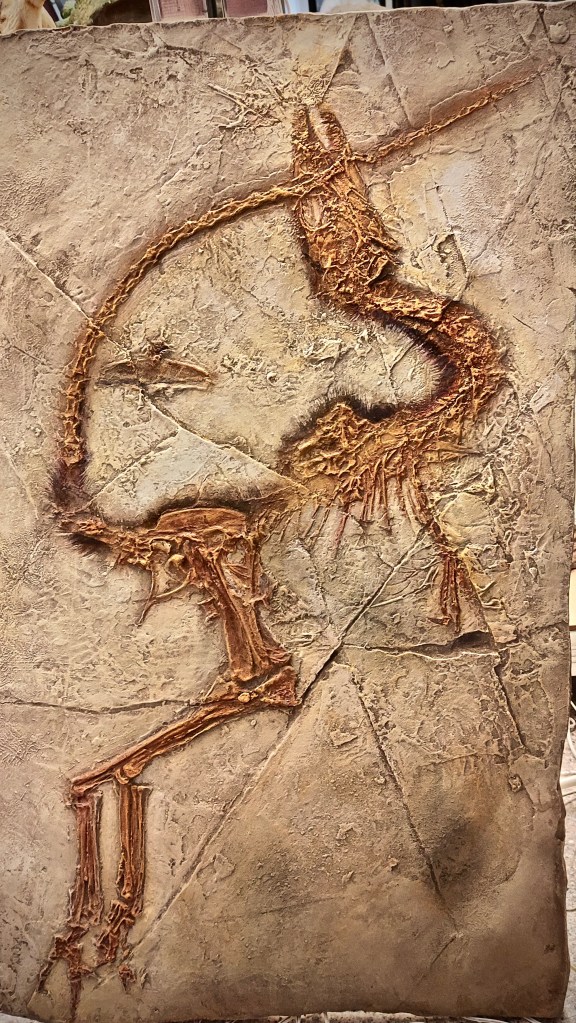 This cast of Sinosauropteryx is double the size of the most famous one where the feathers are so evident… the evidence for feathers for this one is at best sparse… but they are there no doubt. The claws are clear in this one too. The bones colour in the original fossil is lighter and the sediment looks different, which is tricky because everything changes from light to light. I thank Peter Norton from Gondwana Studios the challenge to make this better… we have one customised by him at the Dinosaur rEvolution exhibition. Don’t miss it!