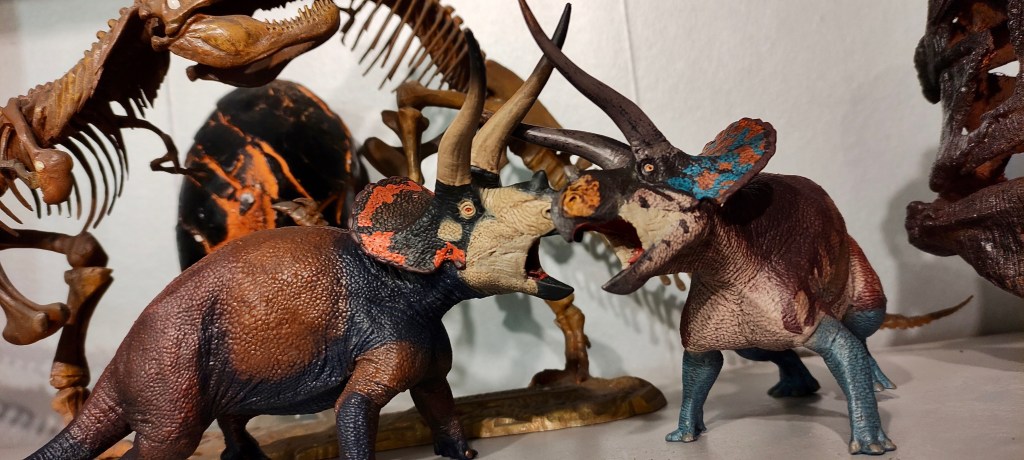 To complement the careful fossil model colour restoration, I’ve been working on some toys, including favourites that I feel I owe them some modifications to make them more believable… I have still some to go, but I first selected this Triceratops from Eofauna that I always liked, but one that regrettably went for the “full smile” cheek-less look that certain paper has brought to the fore… and that I don’t buy at all.