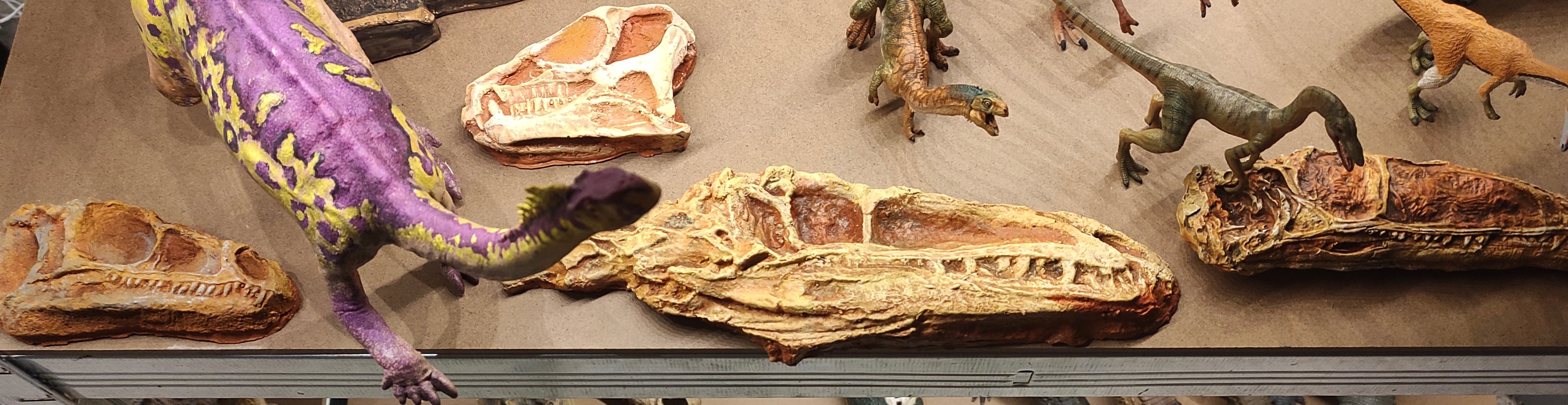 On top is is a great miniature Baryonyx skeleton in the process of fossilisation sculpted by Dalia and Hector. Under, some plaques of classic skulls: Eoraptor, Heterodontosaurus and Coelophysis. The Triassic section in my collection!