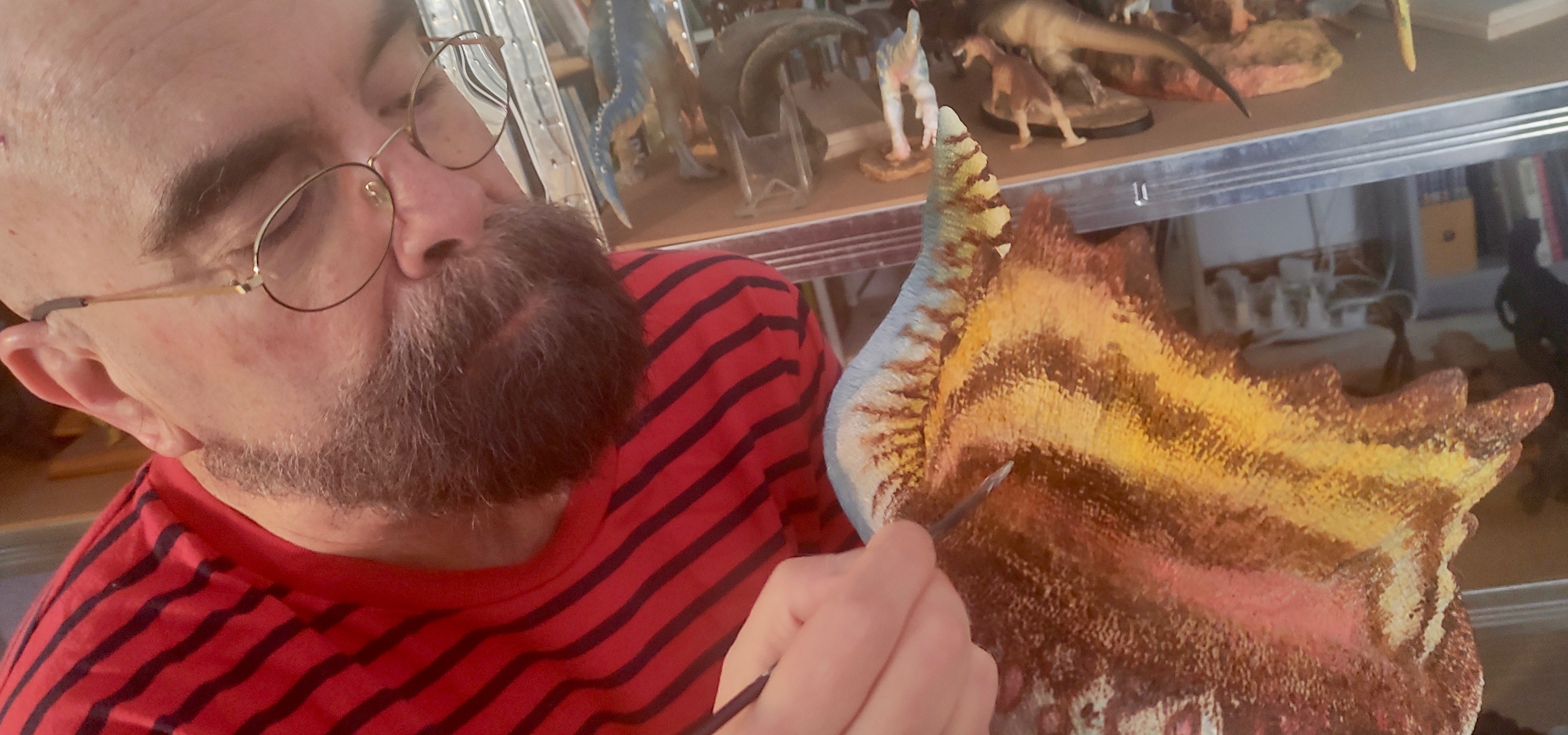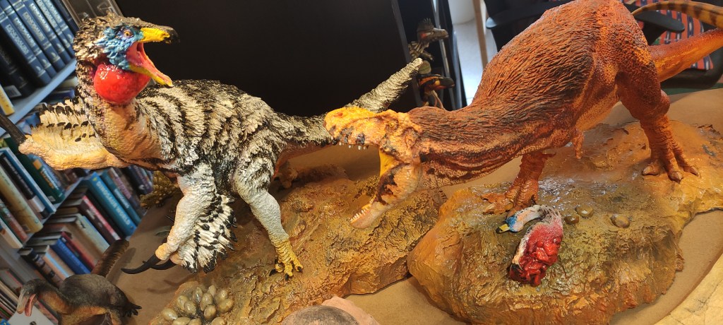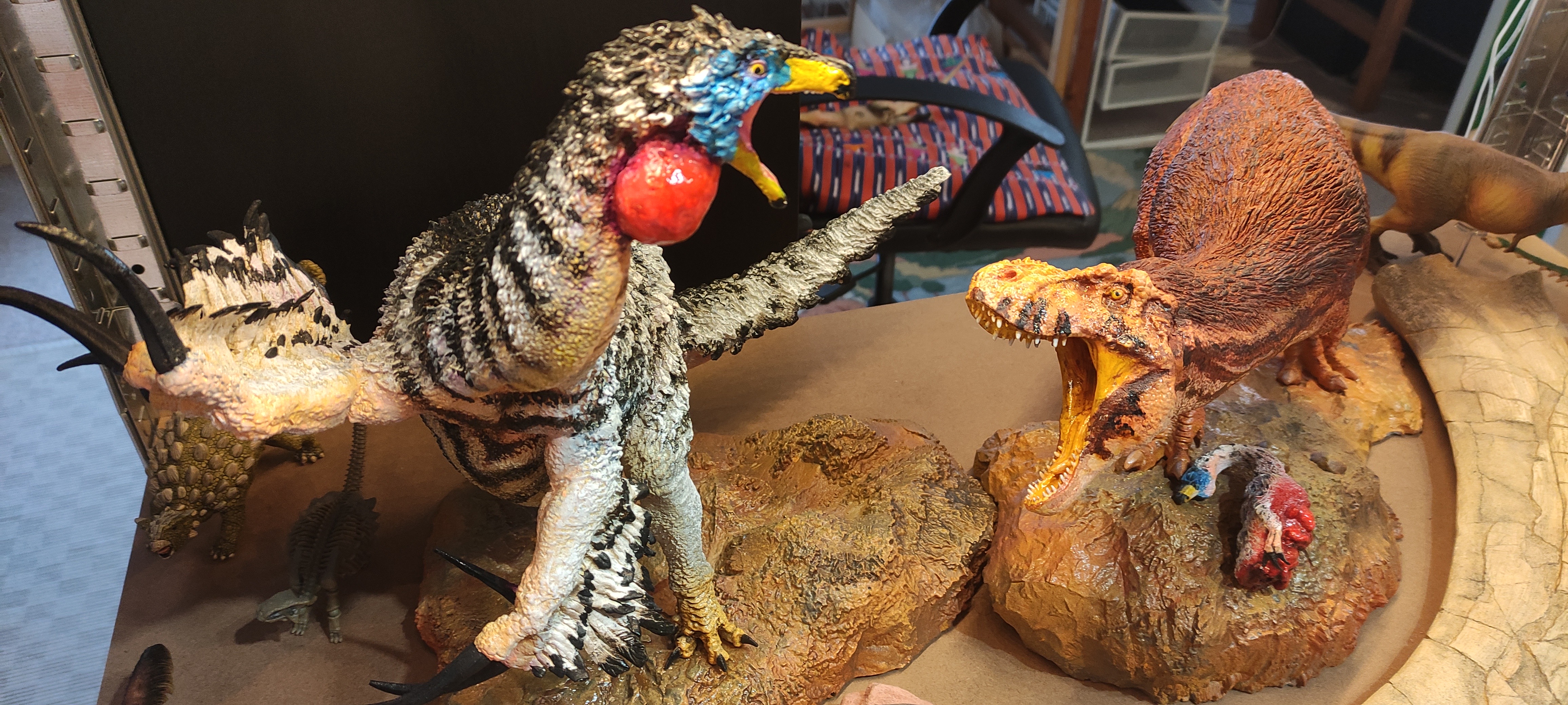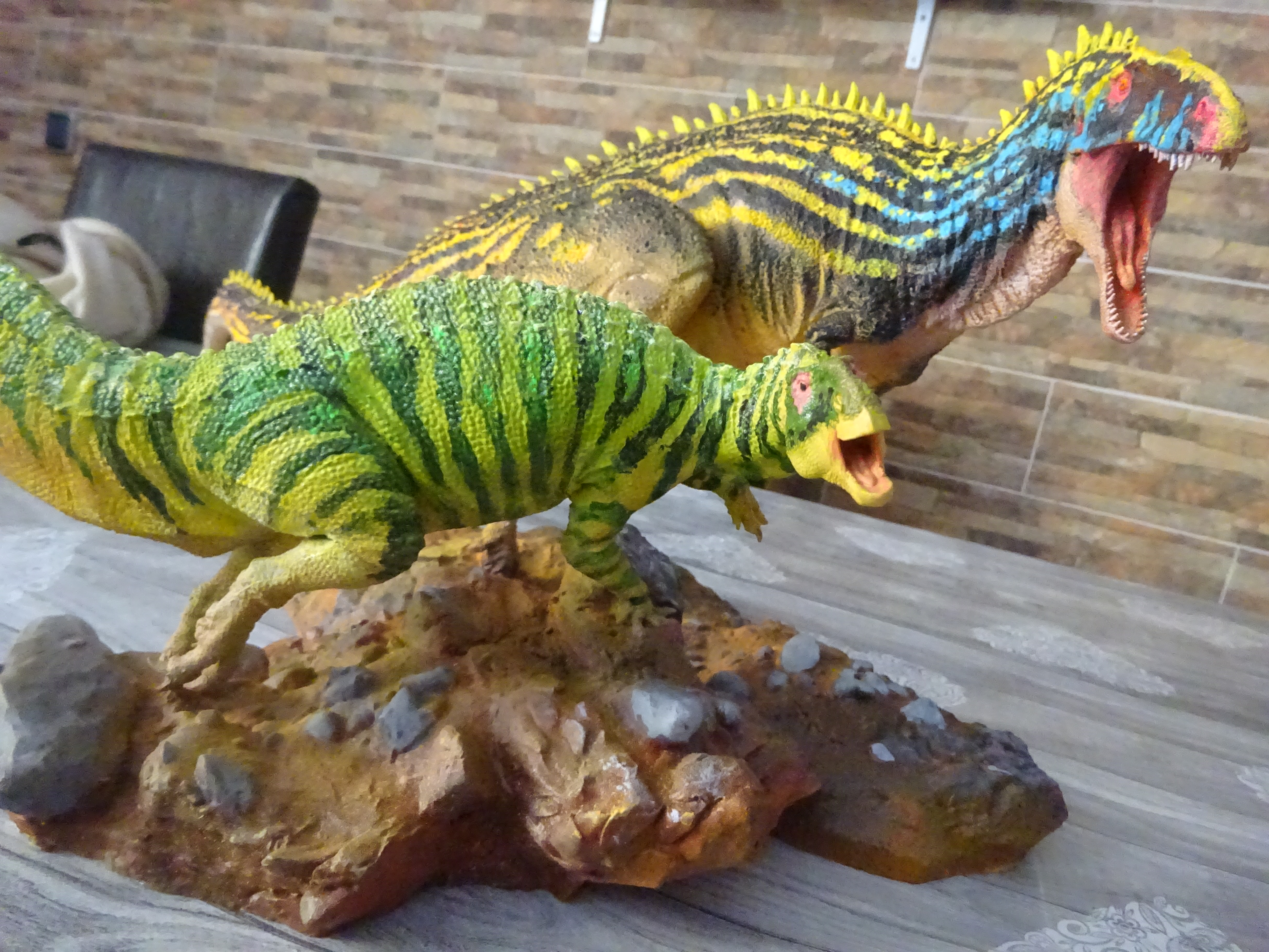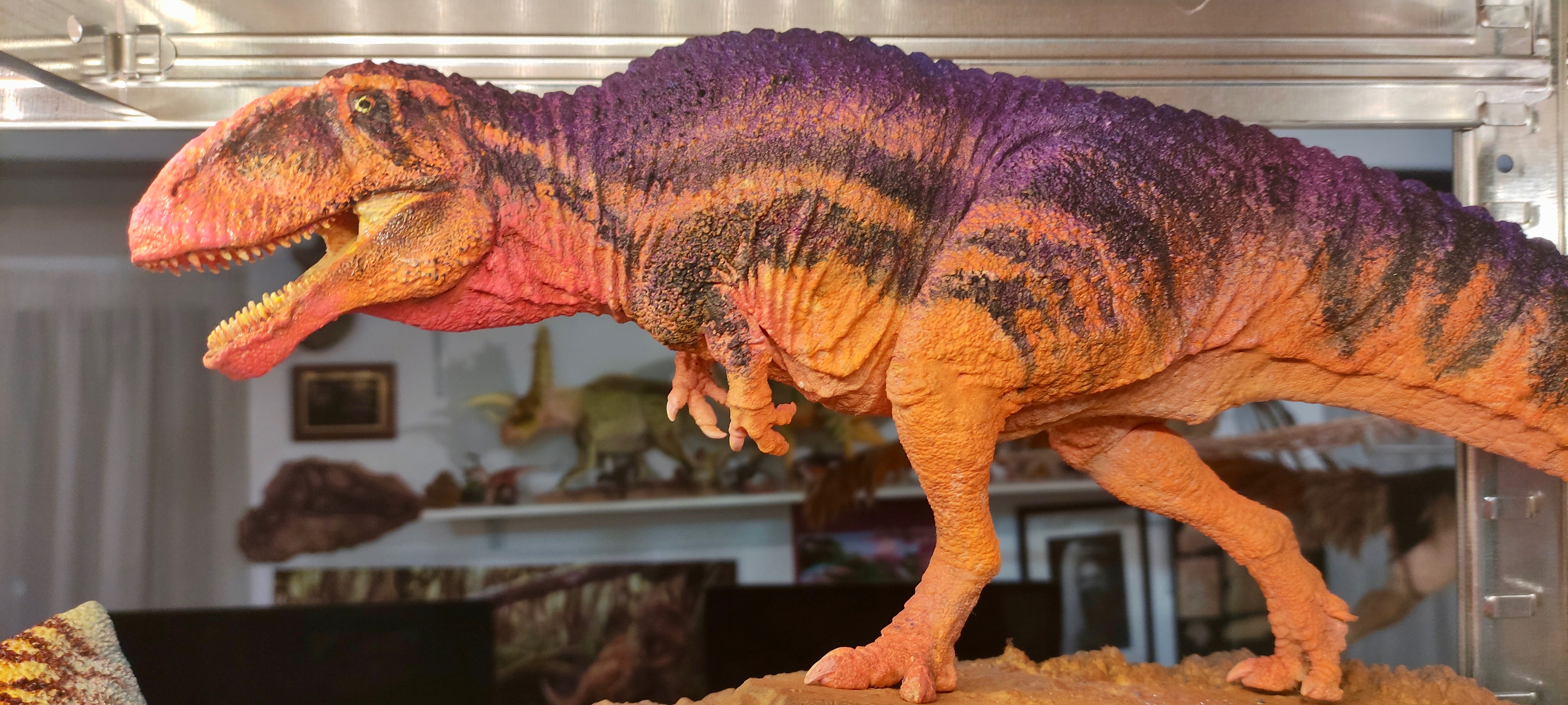First time I saw his models I felt immediately identified with his style (because he DOES have a peculiar style that will always stands out from the rest, sometimes warts and all!)… so I have dedicated a good number of hours to customise several of his models… respecting the work, but sometimes adding details and colours that turn the whole thing into a kind-of collaboration. He liked my extravagance but at the beginning I’m sure he was utterly surprised by the flaming colours and the fact that I even changed skin textures (Tarbosaurus is now feathered too) and added kinetic feathers to his magnificent moving Therizinosaurus guarding its nest.