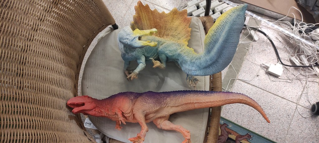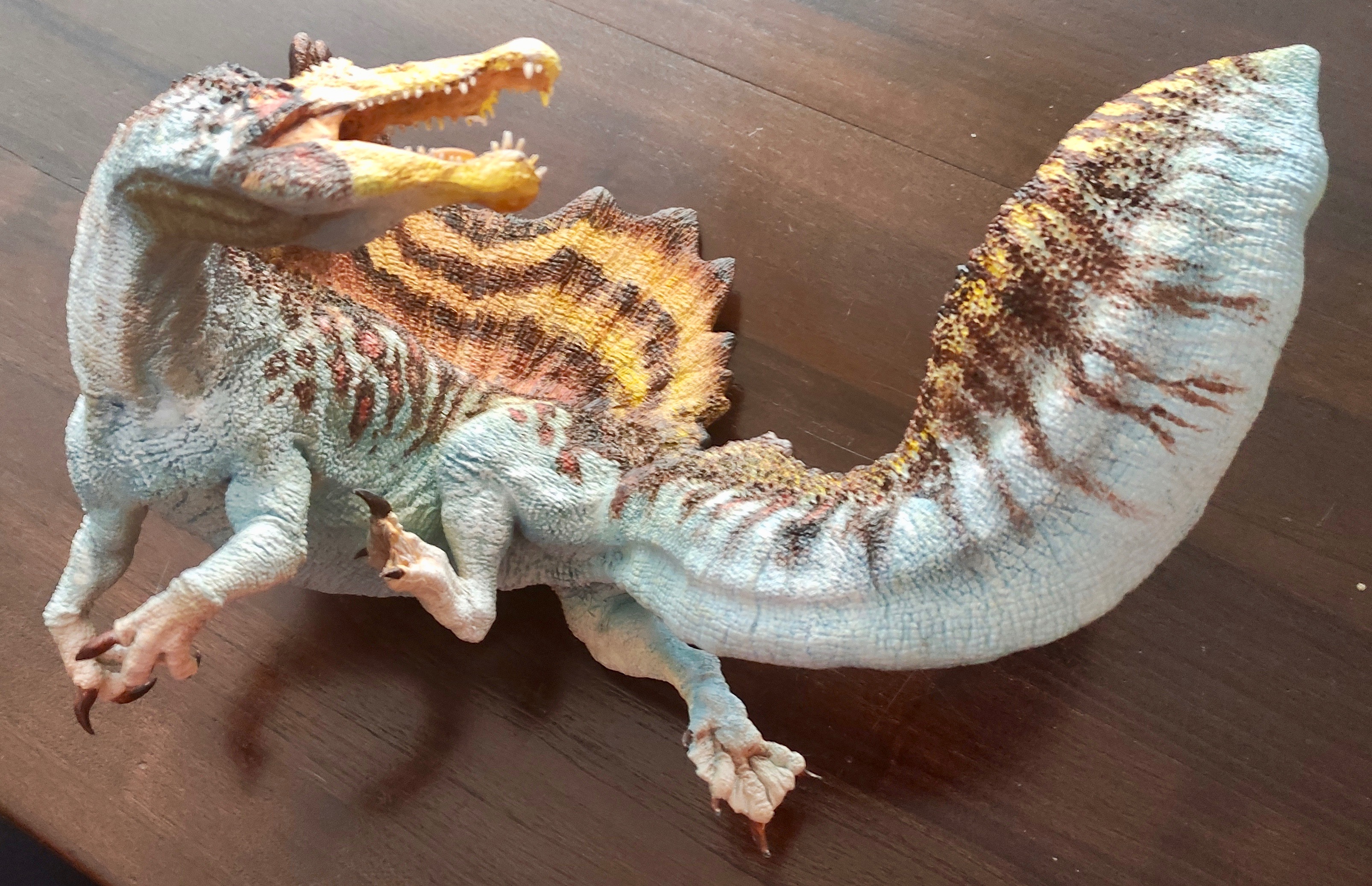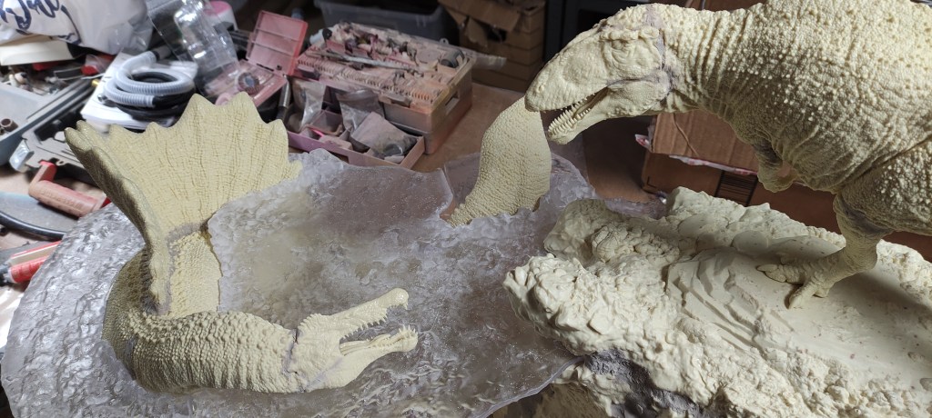I selected some colours from my own illustrations to go with his creations… and the Carcharodontosaurus tentatively looks like a hippo coupled with a vulture… while the Spinoisaurus is simply a recreation of an old classic, now with the right proportions and posture.
