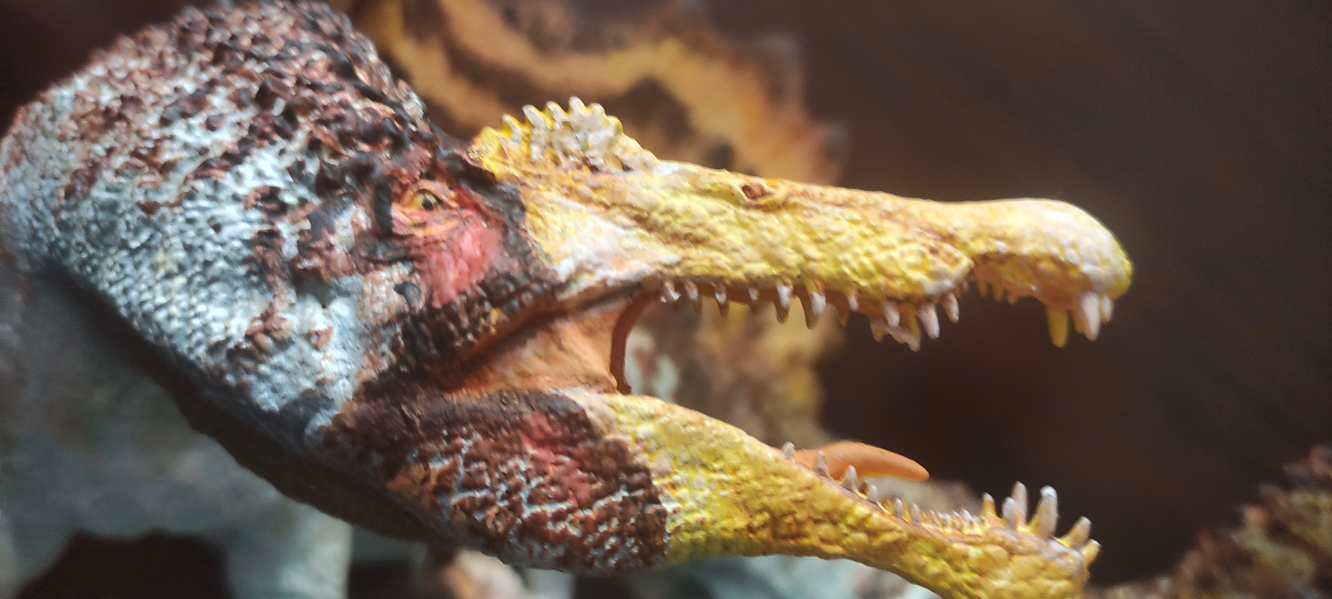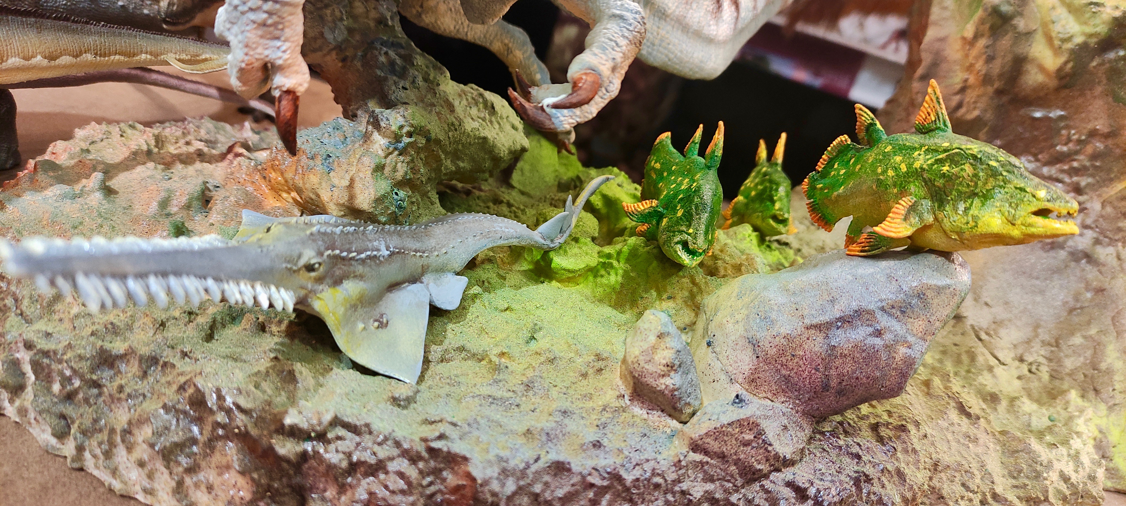 His latest work has taken me at least 12 hours a day of work during a week and a half… frantic! But you have to admit, there is no better, more fantastic, dramatic recreation of Spinosaurus anywhere! Spinosaurus is startled by beautiful Carcharodontosaurus, and the animal dynamics are astounding… but not only that, Passion Charger is overly ambitious with his scenarios…he is always going over the top adding more and more details surrounding his already scrumptiousfigures. I must admit… his scenarios are many times more complex to build and paint than the figures themselves… and he can go over the top with the extras too! This time it’s a river scene, resin water planks included, with half the scenario under that “water”! Contemporary coelacanth Mausonia and Onchopristis fishes are added to the scene… and even a turtle recreated to the maximum detail! If you consider the size of the carnivores, these fishes were simply enormous and the diorama can’t possibly reflect the real size of the whole thing.