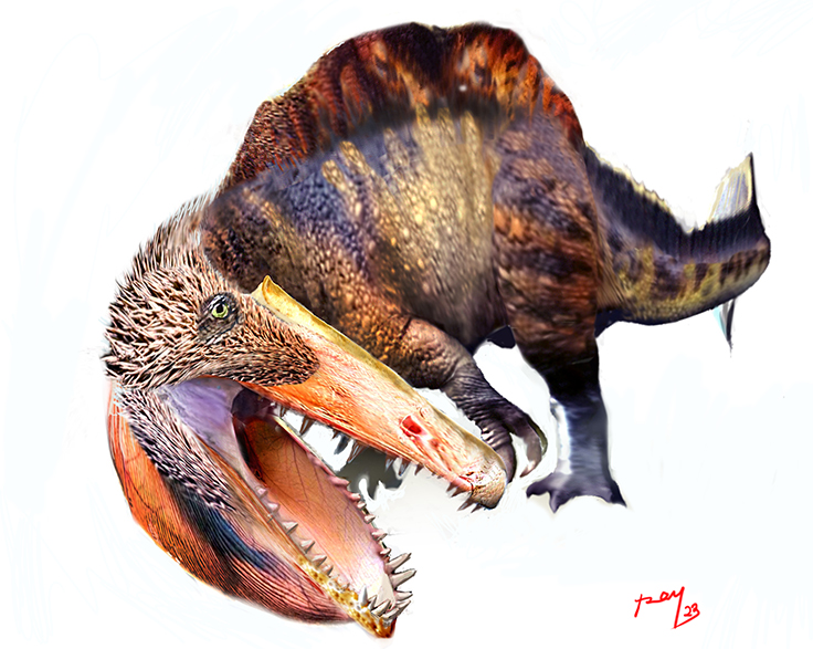 Gondwana was the land of the spinosaurs. Irritator has been reconstructed many times, mostly with a Baryonyx-like body and Angaturama skeletal elements but it has never been seen like this. A long time ago I did a reconstruction of a Spinosaurus with a big fish sticking out of its jaws expanding the lower jaw sideways as a pelican would do… the new study of Irritator