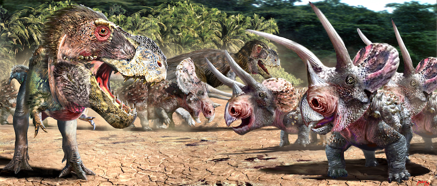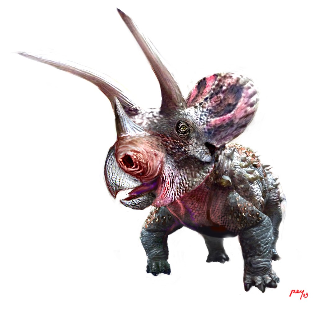 Yes… they continue to be my favourites, but this time everything you see in this mural is based on real skeleton mounts in museums! The new Triceratops mount(s) that I’m basing these new ones in are supposedly very complete… and the head proportions are just really outlandish. Yes indeed they are big headed animals, even more so compared to their body… we have been used to the old Triceratops models and reconstructions with small heads… but I have seen this trend of increasing the head proportions of ceratopsians with respect of their bodies ever since I was surprised by the gigantic head of Pentaceratops compared with a rather small body… and now we also have the recently auctioned Triceratops “Big John”.
