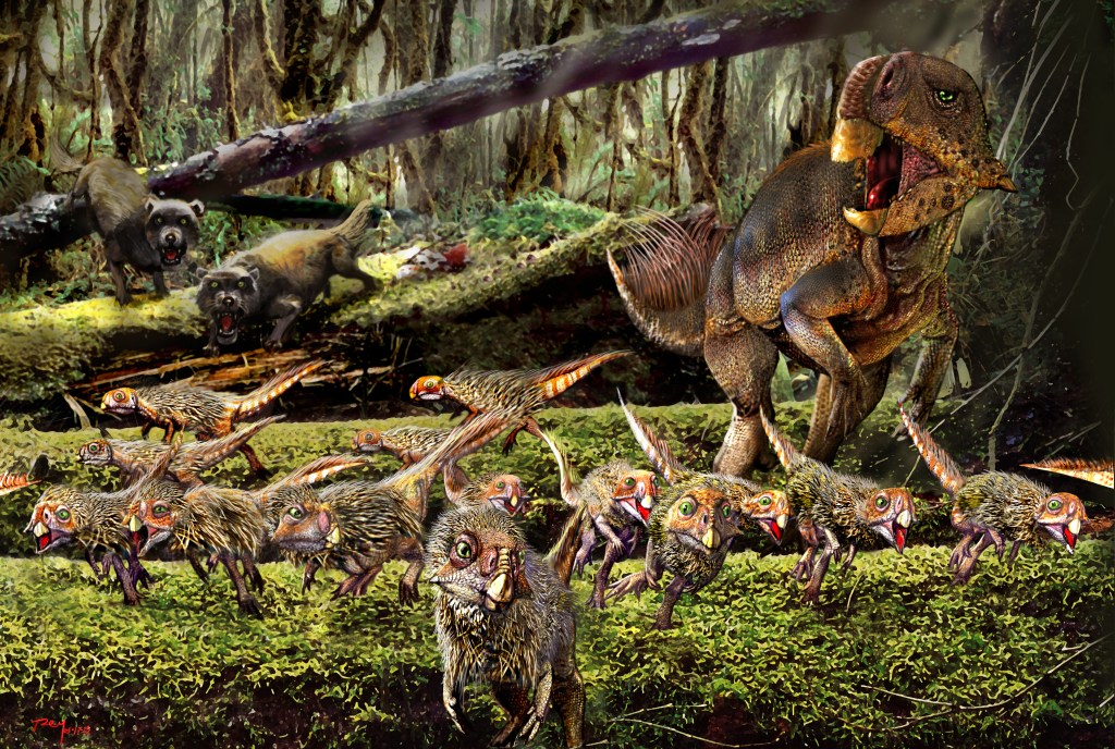 See the article here:https://www.scientificamerican.com/article/mammals-preyed-on-much-larger-dinosaurs-a-stunning-new-fossil-reveals/#:~:text=Based%20on%20the%20size%20of,times%20larger%20than%20its%20assailant.http://Scientific American