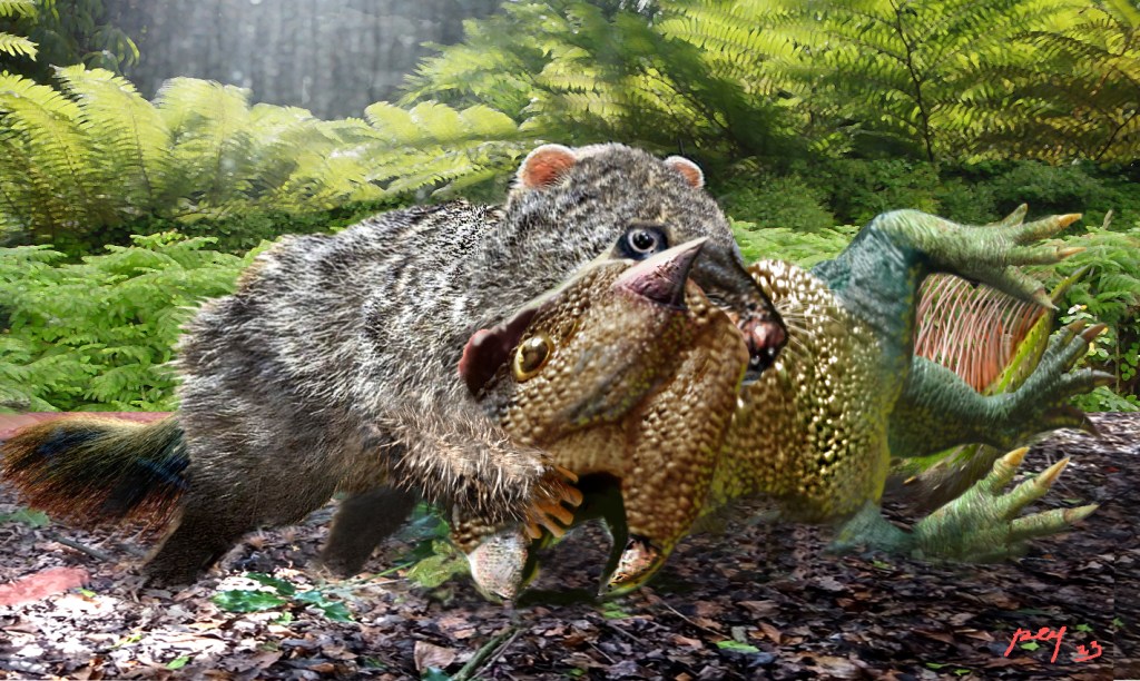 Among the fossils that are all the rage these days is the famous “gigantic” Repenomamus Cretaceous mammal entangled with a Psittacosaurus, in what is apparently a battle to the death… rivaling the famous Velociraptor and Protoceratops battle from the Gobi desert. However, it has also been proposed that we are seeing a mammal famous for having bones of little psittacosaurs in its belly in some of its fossils, scavenging the carcass of an adult or subadult psittacosaur, As we know Repenomamus was a giant for its age, being the size and shape of (roughly) a badger…. to follow the controversy I decided to do two “ambitious angle” versions… a ferocious predation scene and a scavenging scene… which one would you prefer? It is a rather daring view… but what are we here for?