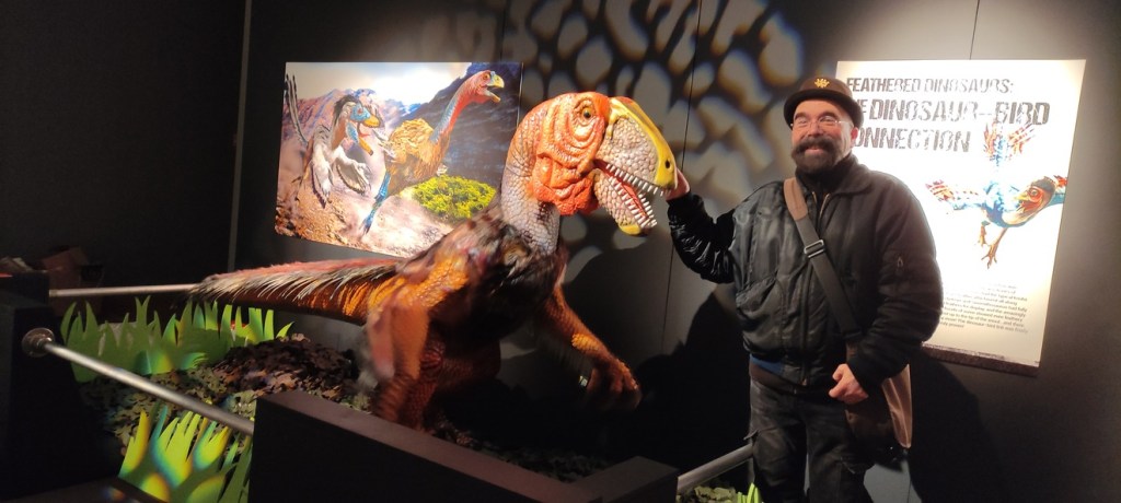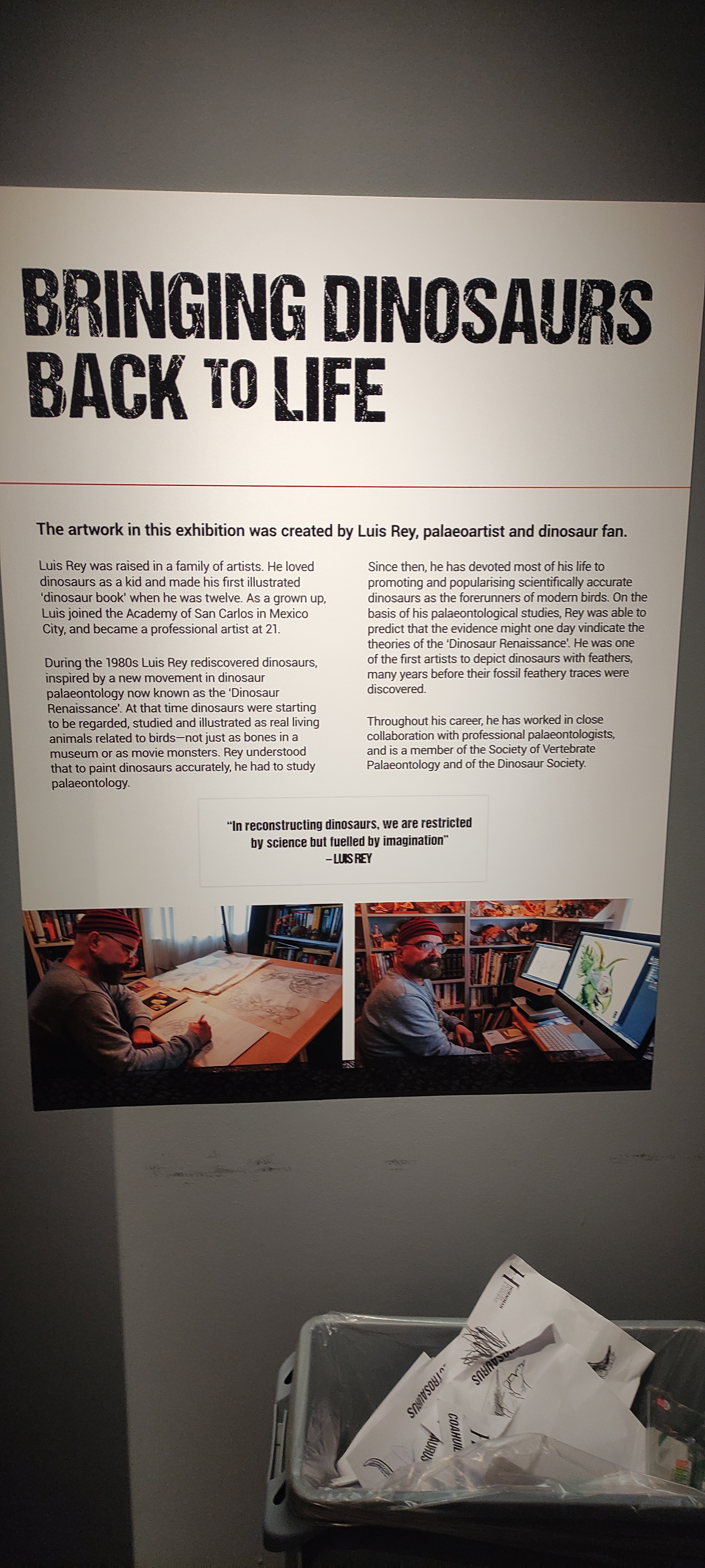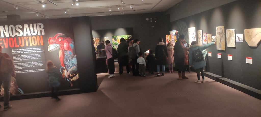 Needless to say. the dinosaur-bird connection was also a surprise to so many. The reaction of the public was going to be the most outstanding feat of this whole event. The first day I was wary that we would have an audience split into rowdy kids and bored parents… but, by the second day the reaction was quite the opposite. The kids were having a field day obviously, but this time the not-so-kids and parents were paying very much attention and followed the numerous explanatory texts. Dinosaur rEvolution indeed! Every time I saw someone interested in anything specific I would try to cautiously intervene and expand the explanations… some even recognised me!… and the reactions were amazing. The whole purpose of this exhibition is to shake-up the expectations of all the dinosaur exhibitions done before… and I think we have been succeeding. People come out with a completely different view of dinosaurs and rather shocked by the fact that they were either , small, feathered or quilled… or gigantic oddities… whatever! They came out with the notion that they were after all a veritable variety of animals… not monsters… and curiously the one that scared the kids the most was thjs re-creation (or more like an animatronic caricature) of one of my better known paintings of Deinonychus!