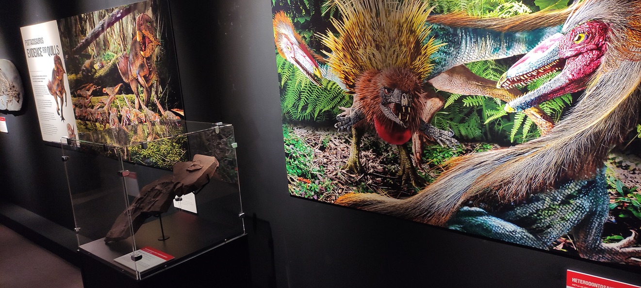 Not many people know the troubles we have had to go through to finally bring this exhibition to Europe. The odyssey was in danger to become a disaster: a container had been shipped from Australia and had to go through the Red Sea to arrive on time…. well, everybody knows what is going on in the Red Sea and we were in real danger of being attacked by rebels… so, the ship had to go all the way around Africa to finally arrive… just a week before the opening. Yes what you see here is the result of a whole week working against the clock by Peter Norton and the people of the Horniman Museum… until the final couple of days I couldn’t help to supervise the tremendous efforts, because nobody knew when would it be arriving! …. and guess what, despite everything and the fact that the space was too small to add some of the bigger skeletons (That had been already featured in the first versions of the exhibition in Australia and NZ)..,,. the results were amazing! We have always to adapt what we have to the hall… no matter how small or big…The Horniman exhibition resulted to my eyes in something almost intimate, welcoming, colourful and spectacular. The array of rare casts is staggering. From David Sole’s complete Scelidosaurus skeleton to a precious, perfect cast of the quilled Psittacosaurus… especially dear to me since I was responsible for the first illustration ever done of it in the year 2000! Even the animatronics were reasonable for the site… Adding the therizinosaurs with Peter Norton’s exclusive new reconstruction of Falcarius was a plus… and we were lucky those two could fit!