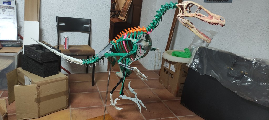 Here you can see the comparison between the mounted skeleton and the old McGrady/Rey fleshed out mode, that I always thought had the ideal proportions for a life-sized Velociraptor.. However, the skeleton is bigger than the model and the proportions are also quite dissimilar. Arms and tail are smaller, the skull is bigger and legs are longer. What it means to have more than 20 years of difference between them. I still find that the skeleton is much bigger than most Velociraptor fossils I know in any case… it may be a different species.. I also have a partial Gaston cast that shows definitively a smaller animal… I suppose we should give a critical appraisal of this skeleton and see what is the source … I suspect ithe proportions are taken from Scott Hartman’s new reconstructions…