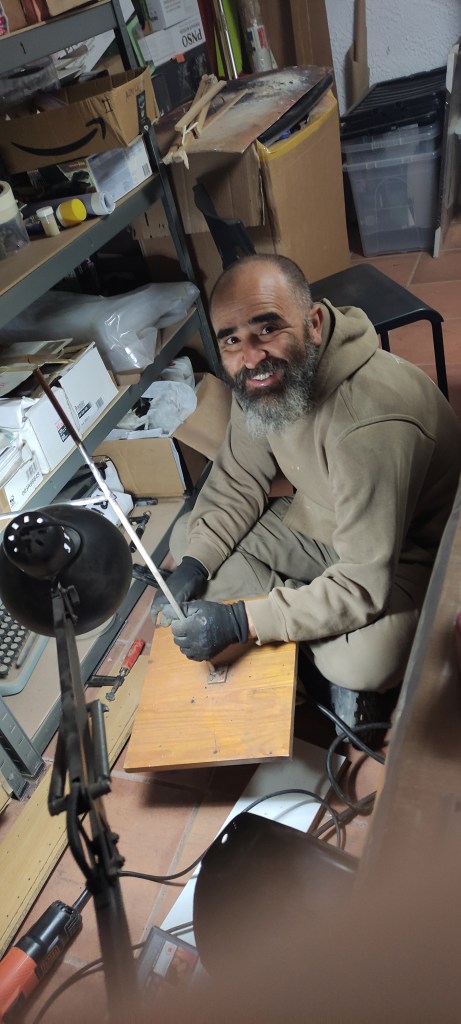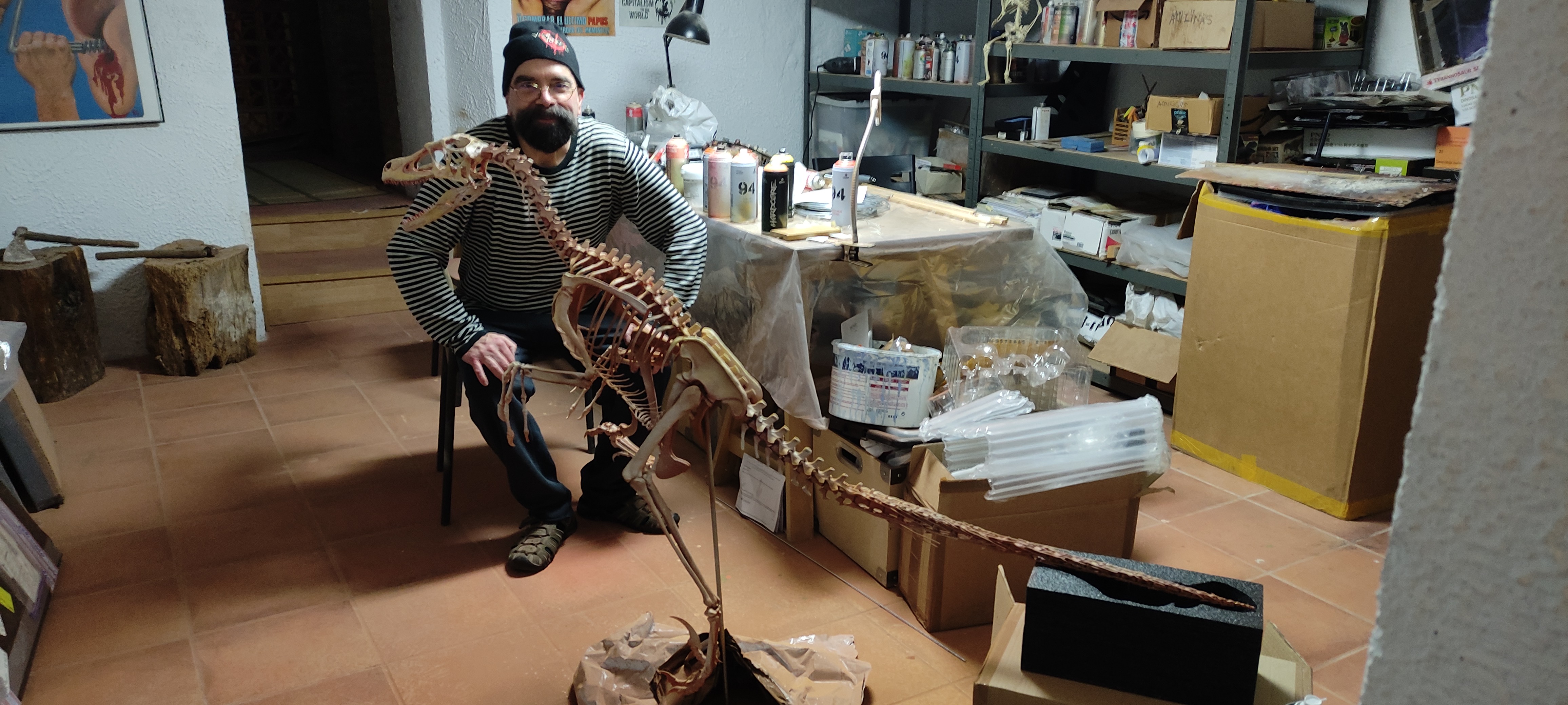 When I finished it, that was the last part to be inserted in the extremely fragile skeleton. To my horror, it was a bit too heavy for the rest of the skeleton and some bones started to crack.. High drama! … .I called my friend Juanvi to weld a base that could support the virtually floating skeleton with its tail without breaking! He did a splendid job.