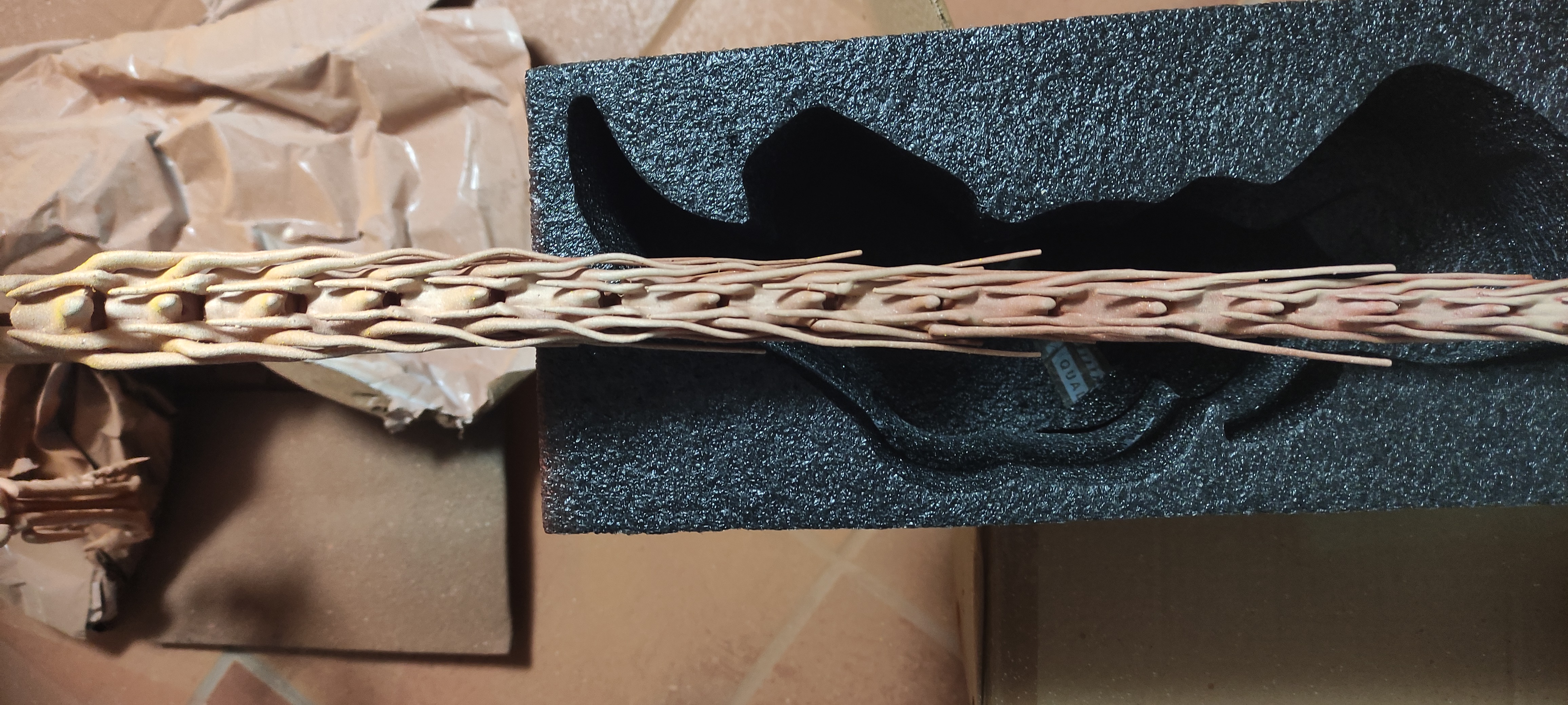 When I finally had the tail, getting into resin “macrame” was close to be an ordeal…I’was not even quite sure if some of the vertebrae were in the correct places… Sounds insane but, I had to “feel them” click and fight with the chevrons to fit afterwards, sometimes using a sharp knife to clean the pieces!… Weaving with resin strands is something else.