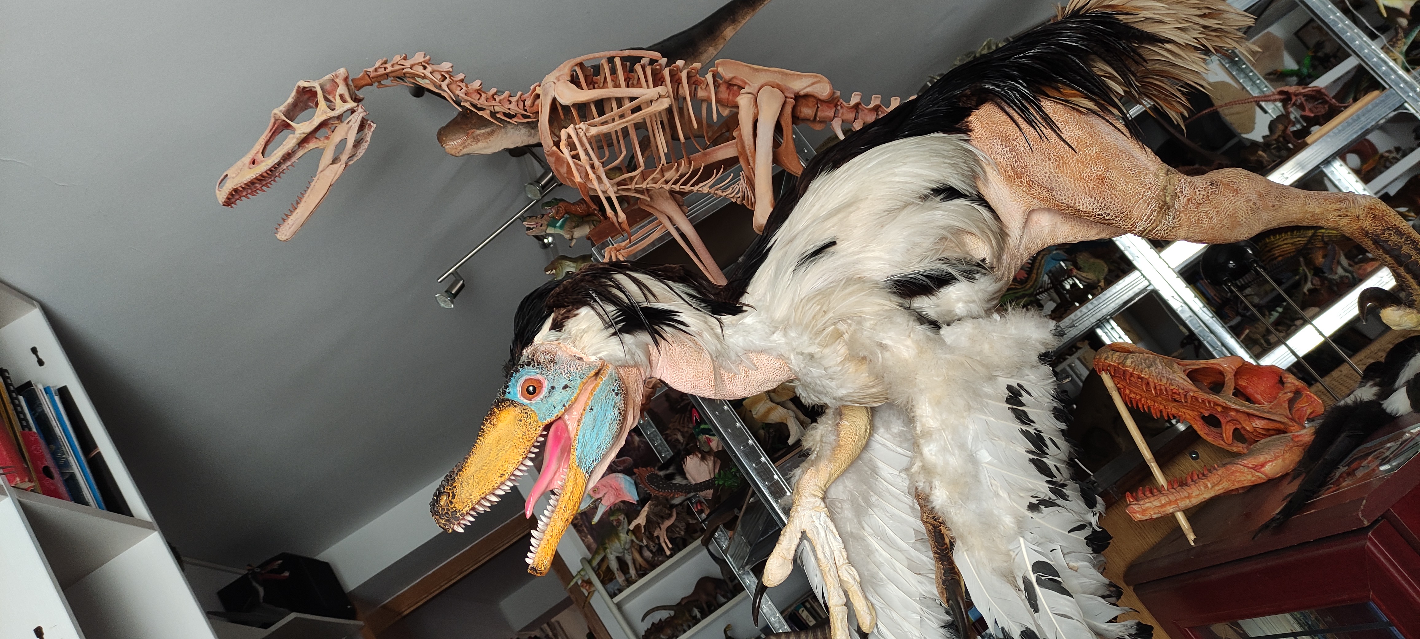 First time I saw his models I felt immediately identified with his style (because he DOES have a peculiar style that will always stands out from the rest, sometimes warts and all!)… so I have dedicated a good number of hours to customise several of his models… respecting the work, but sometimes adding details and colours that turn the whole thing into a kind-of collaboration. He liked my extravagance but at the beginning I’m sure he was utterly surprised by the flaming colours and the fact that I even changed skin textures (Tarbosaurus is now feathered too) and added kinetic feathers to his magnificent moving Therizinosaurus guarding its nest.